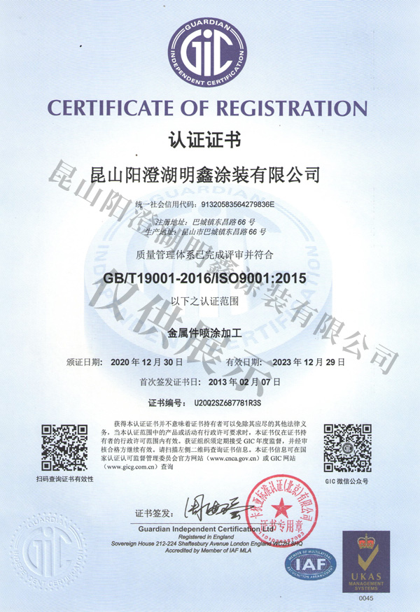 明鑫ISO9001品質證書