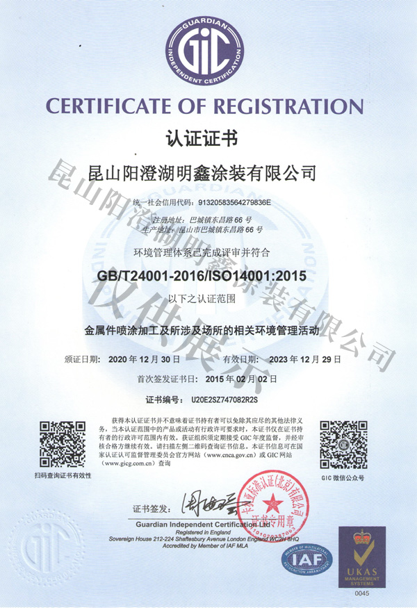 明鑫ISO14001品質證書